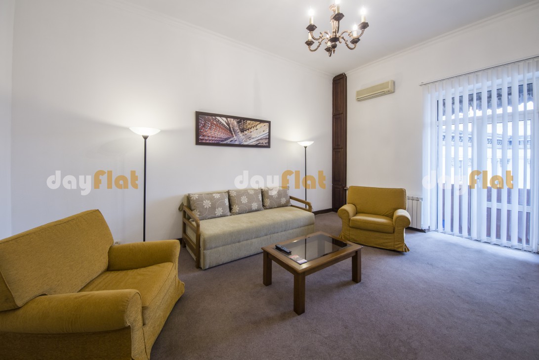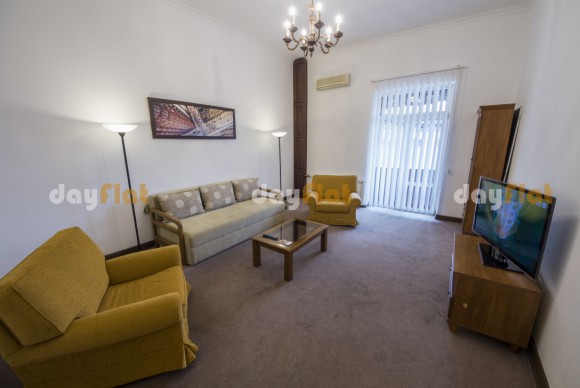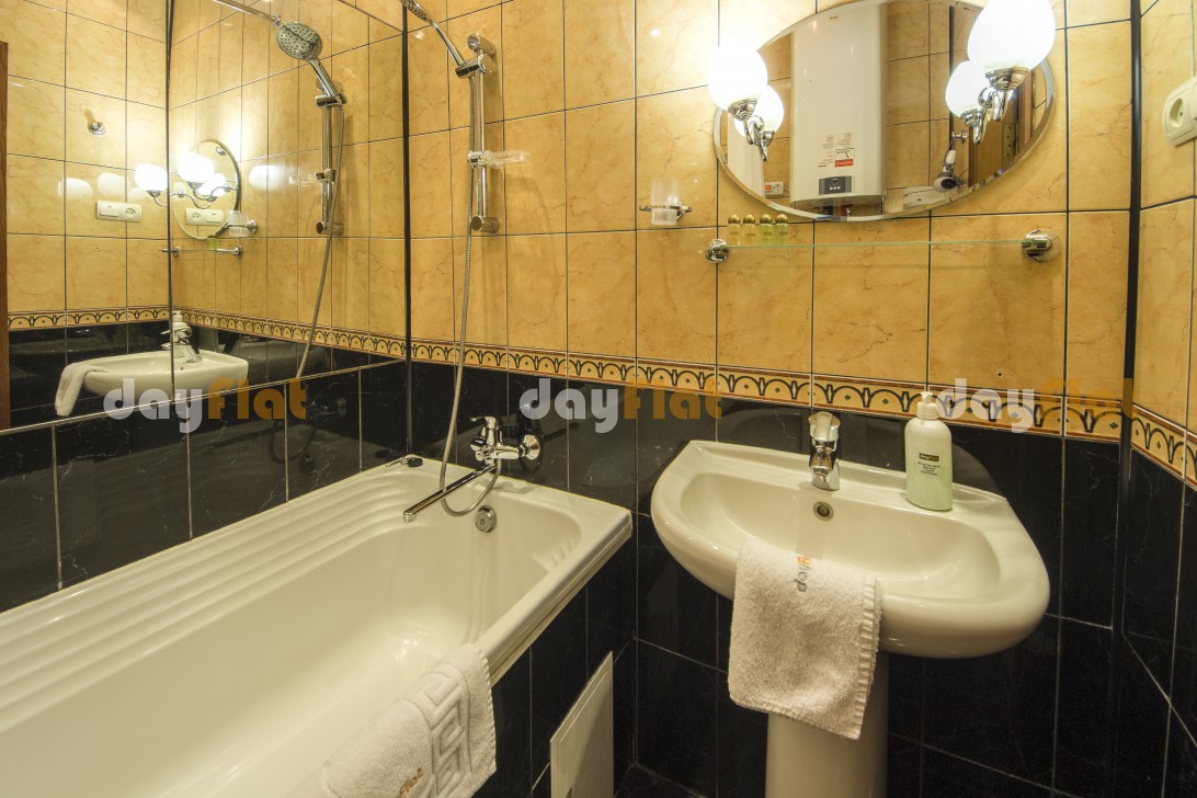 В квартире есть все необходимое для комфортного проживания 4-х человек: двуспальная кровать, двуспальный диван, шкаф, телевизор. Кухня: газовая плита, стол, стулья, холодильник, микроволновая печь, электрочайник. Санузел: ванна, стиральная машина, фен. Снабжение горячей водой централизованное (24 часа в сутки), на случай отключения централизованного водоснабжения в квартире предусмотрен автономный водонагреватель.