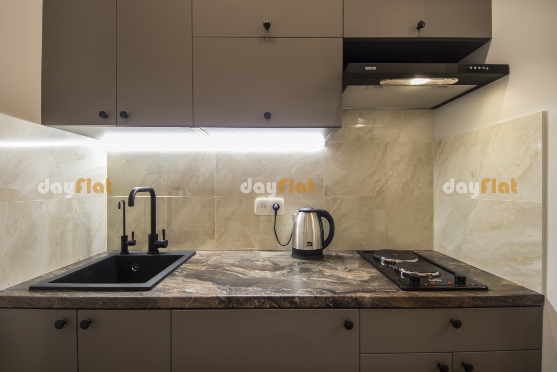 Дизайнерські апартаменти - студіо складаються з затишної спальні, кухні і санвузла. Вікна виходять на вулицю. У будинку немає ліфта.